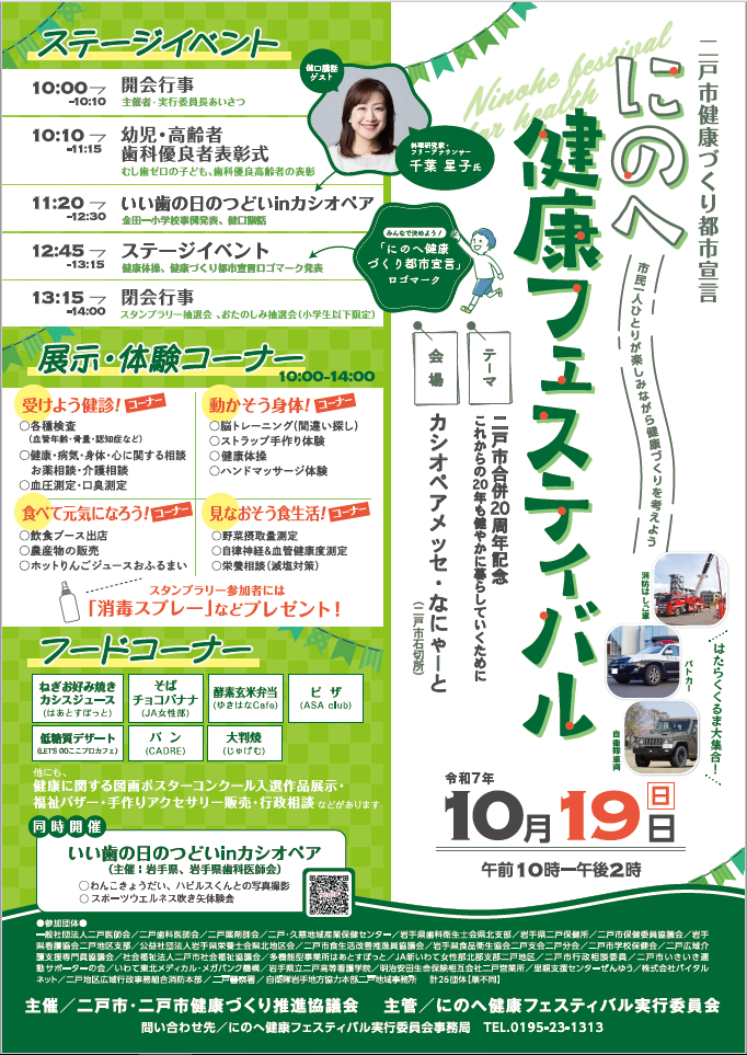 二戸市及び、にのへ健康フェスティバル実行委員会では、市民一人ひとりが楽しみながら健康づくりを考えるイベントとして、「にのへ健康フェスティバル」を開催します。